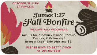 The James 1:27 ministry is hosting a fall gathering for all widows and widowers on October 18 at the pavilion starting at 4:00. We will be having dinner together followed by a...